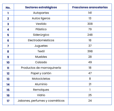 Algunos de los productos afectados que tendrán un impacto en las importaciones son de las industrias automotriz, textil, vestido, plástico, siderúrgico, electrodomésticos, aluminio, juguetes, muebles, calzado, marroquinería, papel y cartón, motocicletas, remolques, vidrio, entre otras. Por ejemplo, la Secretaría de Economía dio a conocer la cantidad de fracciones arancelarias para los sectores que se indican:
