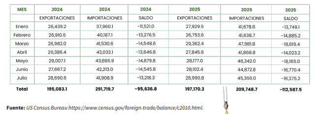 El T-MEC sustituyó al TLCAN a partir de julio de 2020, facilitando el comercio entre ambas naciones, con reglas similares en el acceso a mercados para una gran cantidad de productos. No obstante, con motivo de la pandemia por covid, la balanza comercial deficitaria para EUA marcó un descenso en 2021, de poco más de 5 mil millones de dólares y recuperó su tendencia en 2022. Para 2024 observa su punto más alto con -171,491.2 millones de dólares (mdd) y en 2025, en el período comprendido de enero a junio, es de -96,212.3 mdd. Con lo cual se observa: a pesar de los aranceles, la relación comercial entre México y EUA muestra una tendencia similar a la sucedida en los últimos años e incluso es superior, en perjuicio de EUA, a la registrada en 2024, como se muestra en la tabla siguiente: